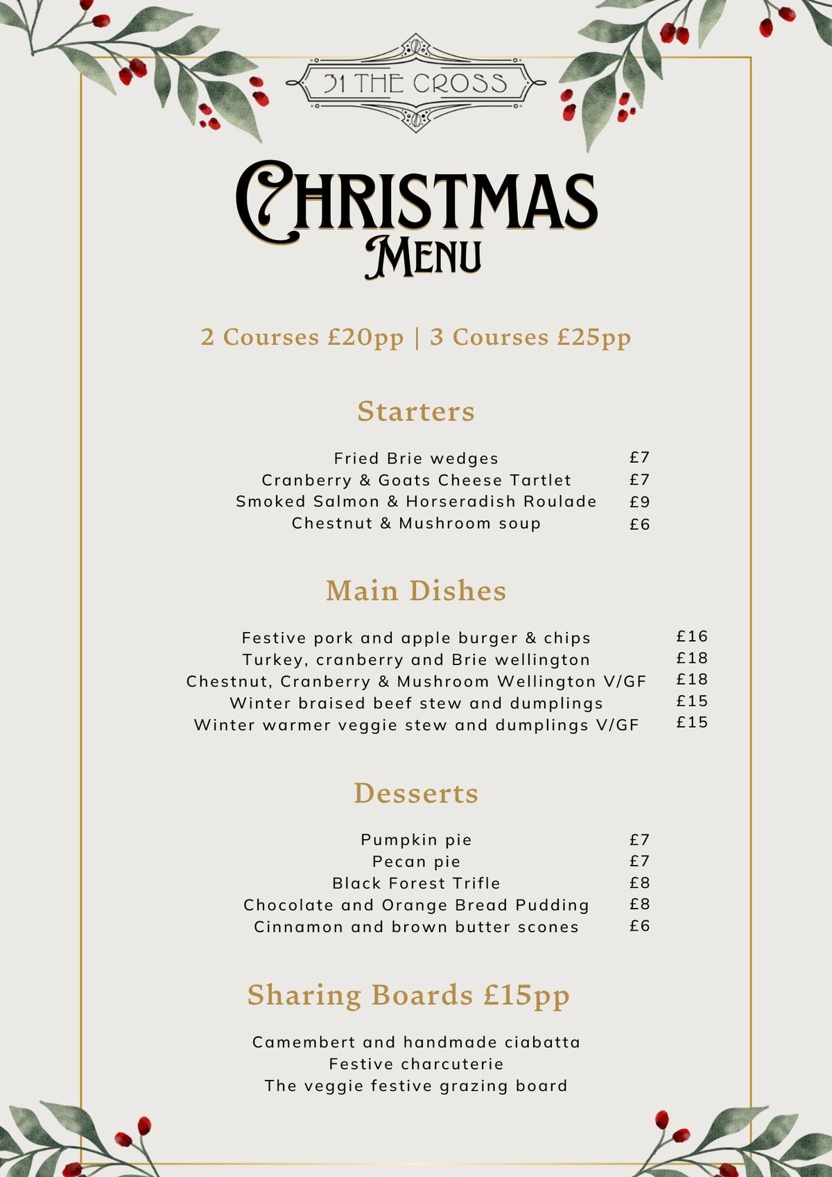 Join us this festive season for delicious food and seasonal cheer. From indulgent starters to hearty mains and classic desserts, we’ve created a menu to make your celebrations truly magical. Whether it’s a family gathering, a festive night with friends, or the office Christmas party, we’ve got something for everyone.